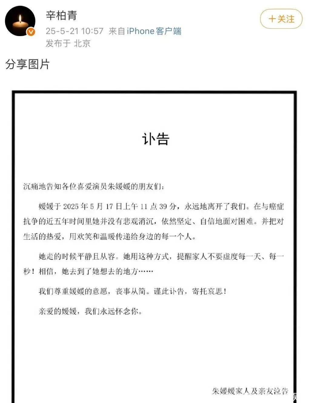 在2025年5月1日,这部电影成功完成拍摄,朱媛媛与团队成员共同合影纪念。照片中,她面带灿烂笑容,没有人预料到,这竟然是她最后一次亮相的公众影像。经过16天的时间,在5月17日清晨,她在丈夫辛柏青的陪伴下平静地告别了人世。