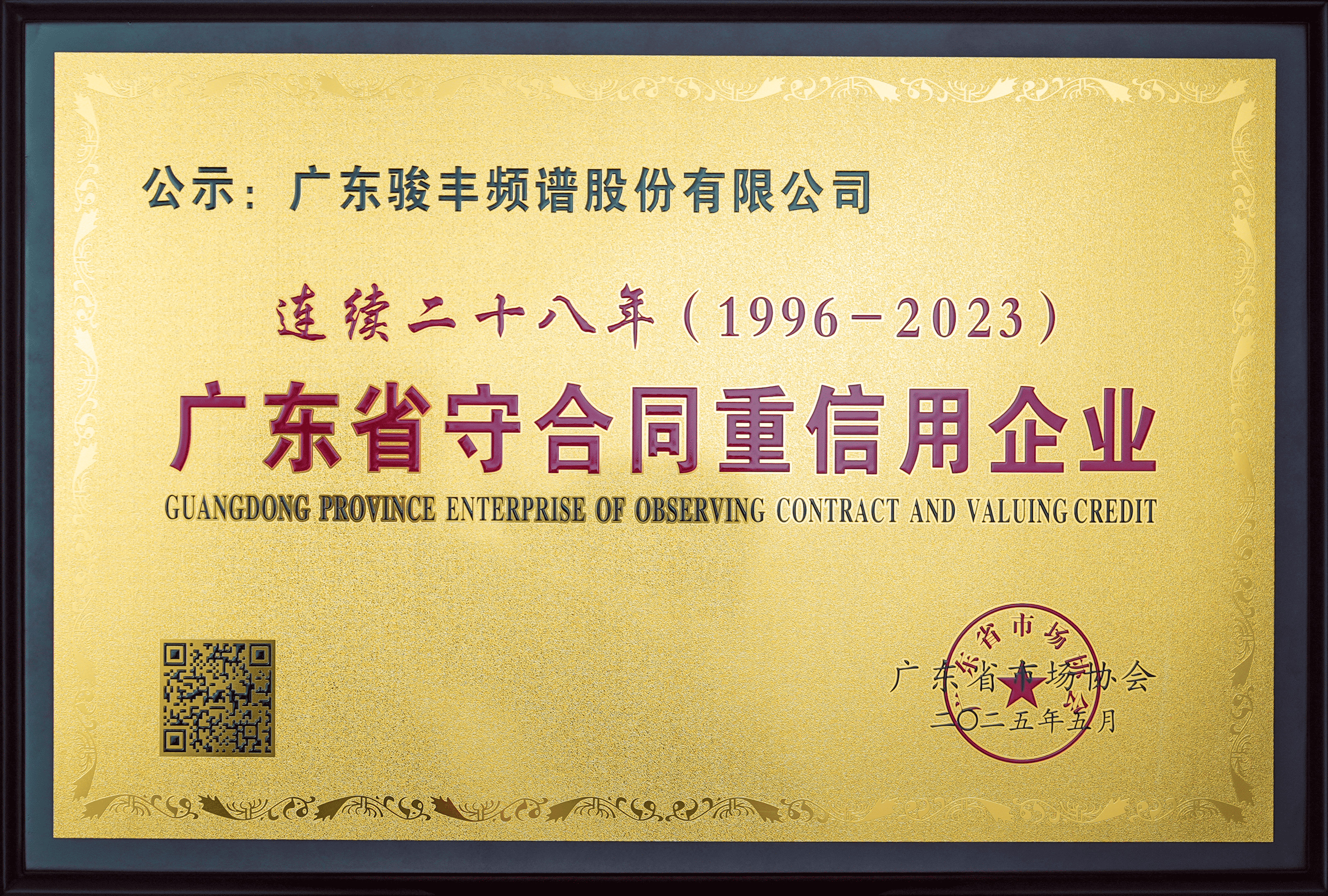 骏丰公司获评“连续二十八年广东省守合同重信用企业”称号